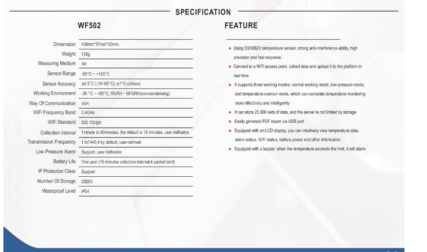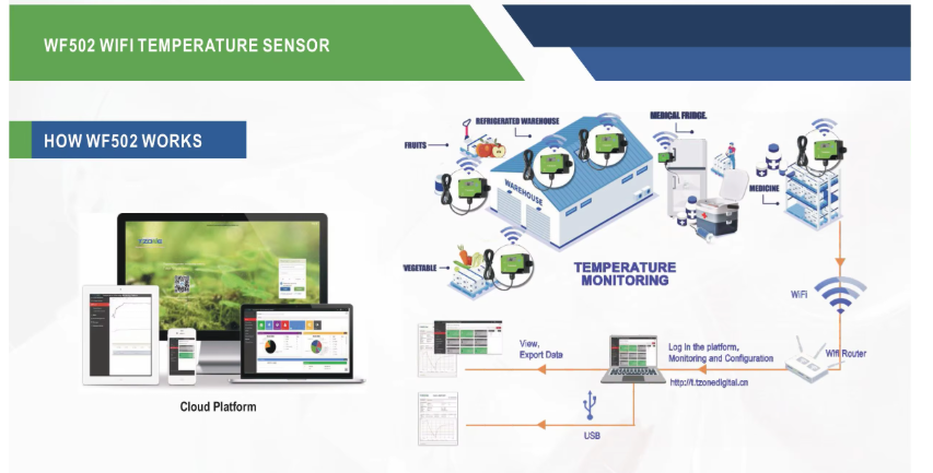 WiFi Temperature Sensor is a WIFI temperature sensor based on IOT technology . It can be widely used in refrigerators, catering, warehouse and HACCP system industries and so on. It can real-time uploading data to cloud via WiFi. Users can remotely view, monitor, and manage data online via any web browser. At the same time, the device also with flash memory to storage 20,000 temperature recordings. And it can generate PDF report via the USB port. With a built-in rechargeable lithium backup battery that can provide real-time data uploading and alarm notifications continously even after power supply cut-off.