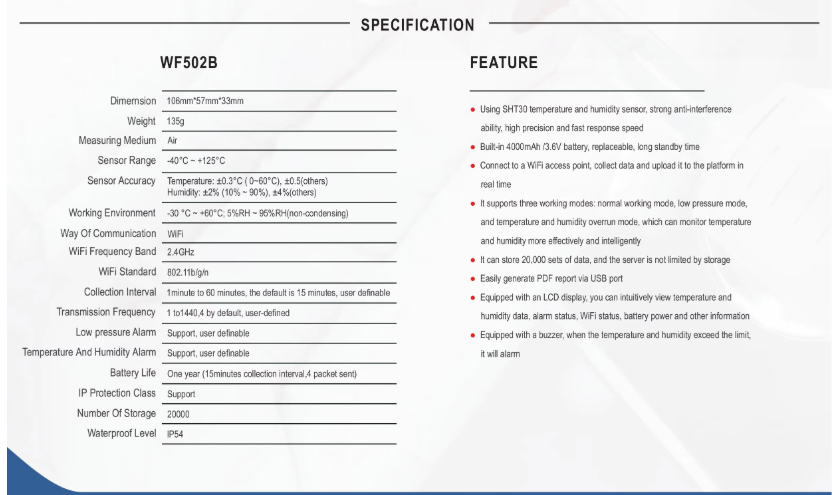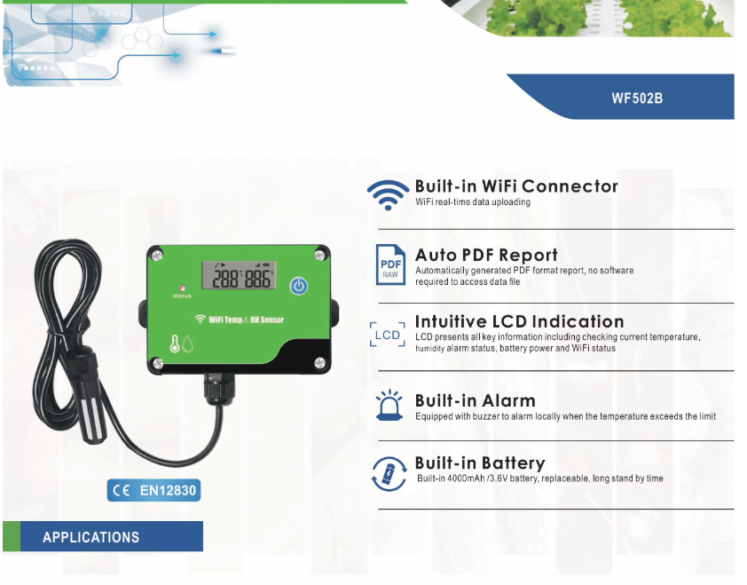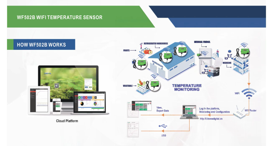 WiFi Temperature Sensor is a WIFI temperature sensor based on IOT technology . It can be widely used in refrigerators, catering, warehouse and HACCP system industries and so on. It can real-time uploading data to cloud via WiFi. Users can remotely view, monitor, and manage data online via any web browser. At the same time, the device also with flash memory to storage 20,000 temperature recordings. And it can generate PDF report via the USB port. With a built-in rechargeable lithium backup battery that can provide real-time data uploading and alarm notifications continously even after power supply cut-off.